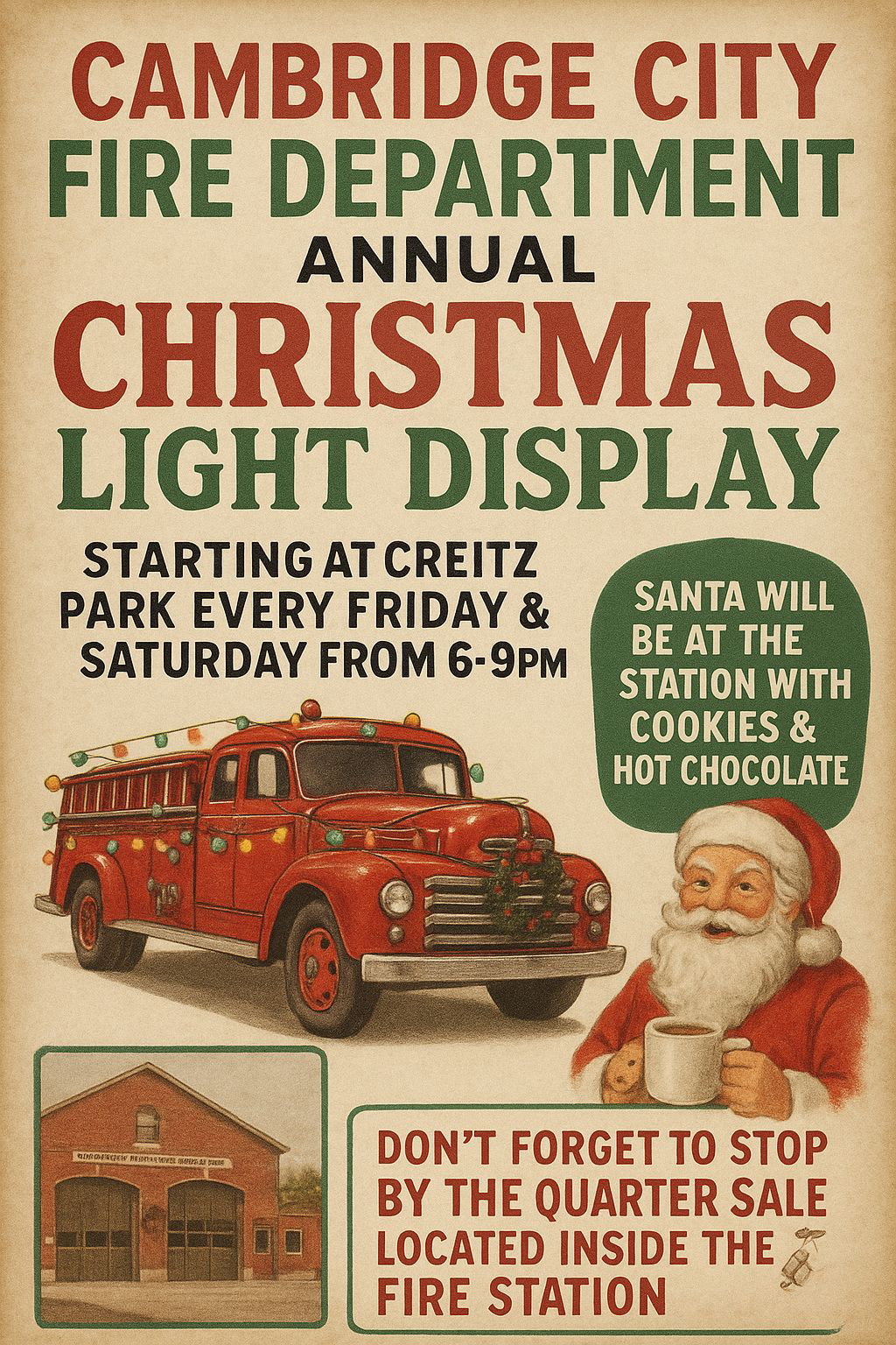Cambridge City exemplifies volunteers making the holiday season magical. The Cambridge City Volunteer Fire Department transforms Creitz Park into a festive Christmas light display, open every Friday and Saturday from 6-9 PM through Christmas. Between Christmas and New Year’s, the light display will take place every evening. Admission is free, with donations welcomed to support the department’s equipment and building needs throughout the year.